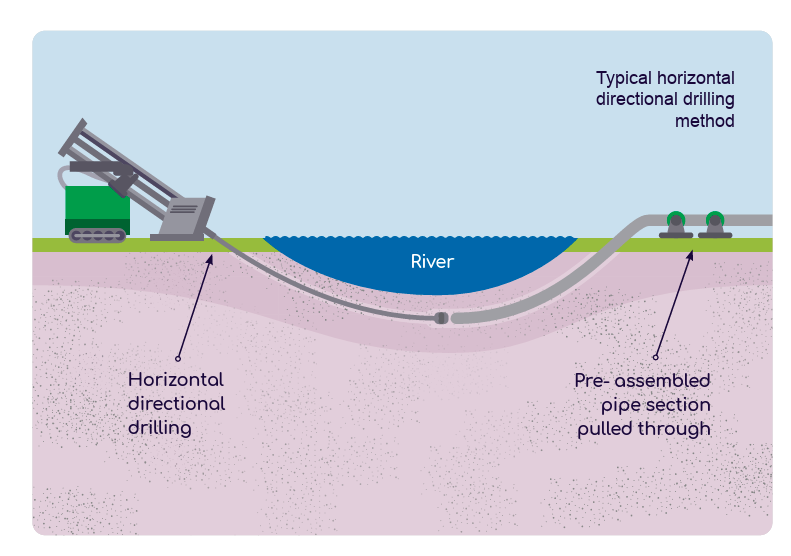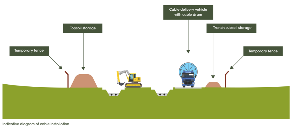 Underground cables are needed to connect the solar areas together and into the National Grid substation. Most cables could be laid through open trenches, where the cable is laid approximately 1m below the ground level, and then soil is replaced on top. Through more sensitive areas, such as woodlands, highways, or streams, we may need to use trenchless crossing methods, such as Horizontal Directional Drilling (HDD), which drills under the sensitive area and pulls the cable through.