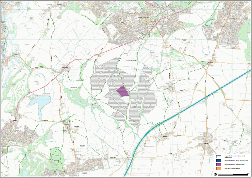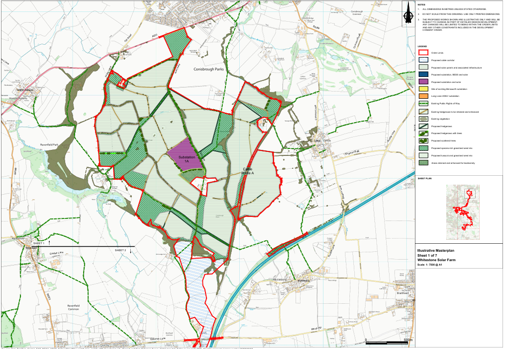 The detailed masterplans are shown to the right and in the links below. These maps show the indicative project design, including the areas for solar panels, substations, and battery storage.