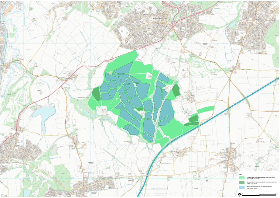 We presented our initial proposals in Autumn 2024 during the first consultation. This original masterplan presented all of the land that we were considering to include in the project and those areas that could be used for solar panels and other infrastructure, known as the ‘developable area’ . In response to feedback from that consultation, we reduced these areas by a quarter to create offsets around homes, villages and public rights of way. After the second consultation in Autumn 2025, we responded to feedback and further reduced these areas around homes, villages, and environmentally sensitive locations. The remaining developable area is now 37% smaller than the original proposals.
